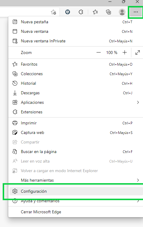 Hacer click con el mouse sobre el ícono con tres puntos en la esquina superior derecha de la ventana. A continuación, elija la opción "Configuración":