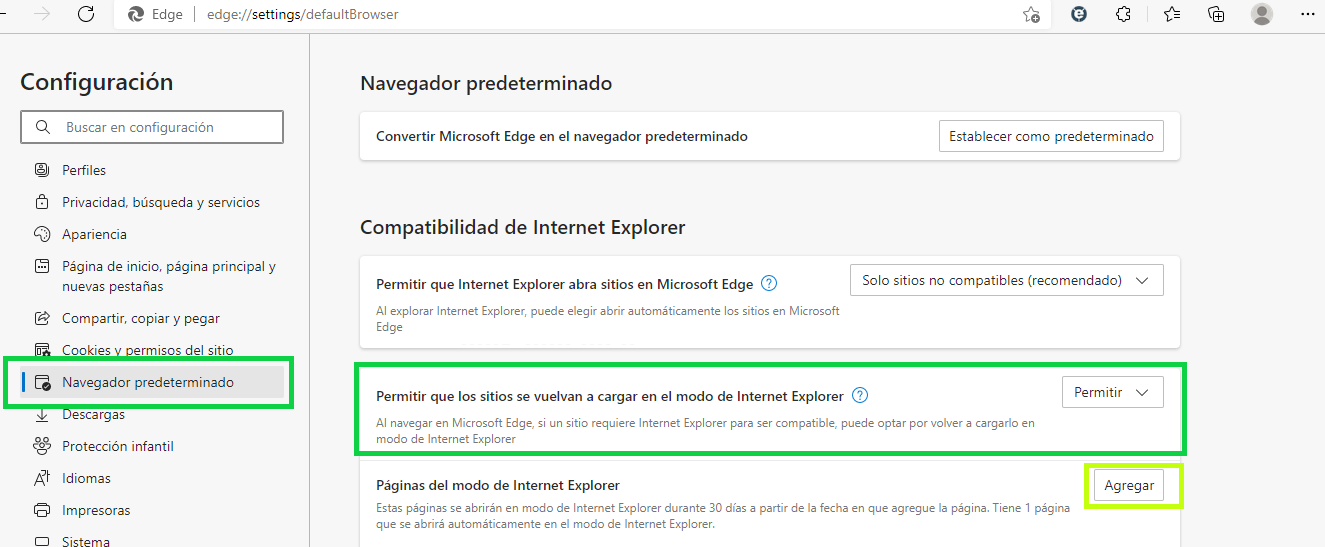 La excepción para poder recargar la página en modo Internet Explorer dura 30 días. Luego se puede volver a agregar como se explicó más arriba o presionar sobre el ícono de Internet Explorer y activar el switch de "Abrir esta página en modo internet explorer la próxima vez" y se agrega automáticamente como muestra la siguiente imagen.