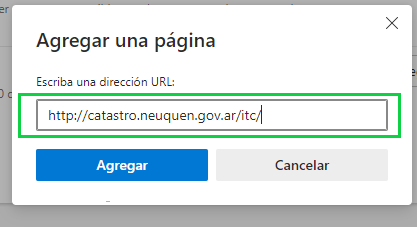 En la misma pantalla aparece un botón que dice "Agregar", al presionarlo abre una ventana donde se debe ingresar la url http://catastro.neuquen.gov.ar/itc/ y después presionar "Agregar".