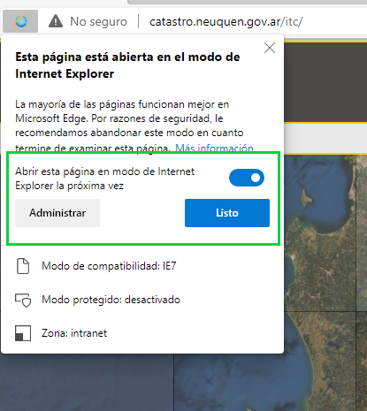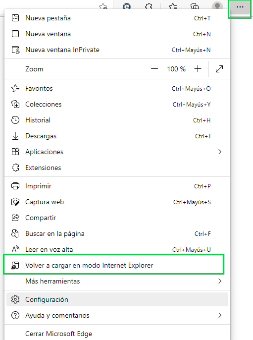 En el caso de que accidentalmente presionen el botón "Salir" se puede ir nuevamente al ícono con tres puntos en la esquina superior derecha de la ventana y buscar la opción "Volver a cargar en modo Internet Explorer"