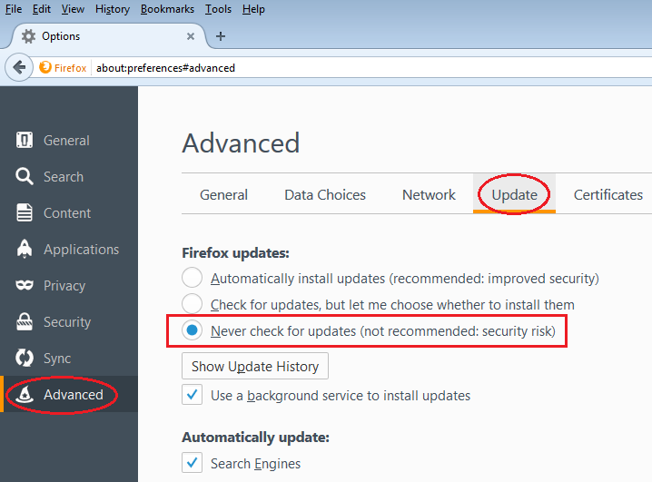 Se abrirá una nueva solapa en el navegador. Elegir el menú "Avanzado", "Actualizaciones". Elegir la opción "Nunca chequear por actualizaciones (no se recomienda: riesgo de seguridad)".