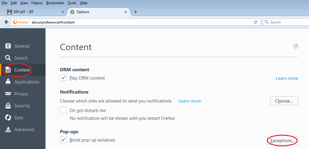 A continuación, elegir el menú "Contenido". Hacer click con el mouse sobre el botón "Excepciones..."