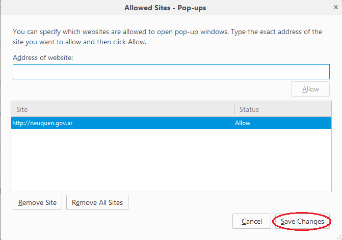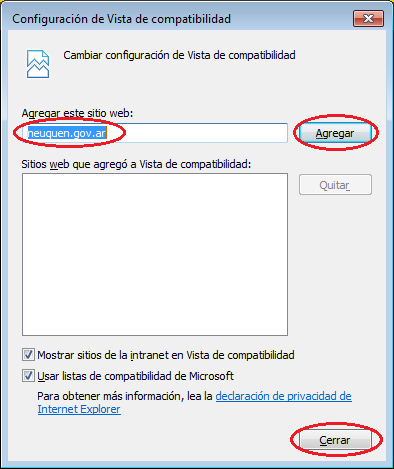 Agregar el sitio "neuquen.gov.ar". Cerrar la ventana para guardar los cambios.