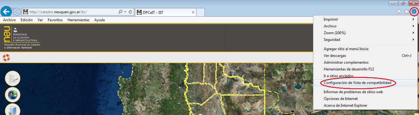 Hacer click con el mouse sobre el ícono con rueda dentada en la esquina superior derecha de la ventana. A continuación, elija el menú "Configuración de Vista de compatibilidad":