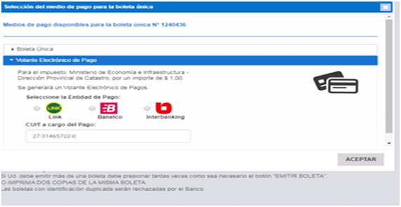 Una vez seleccionada la "Entidad de Pago", haga click en el botón "Aceptar" y se generará una boleta como se muestra a continuación: